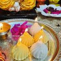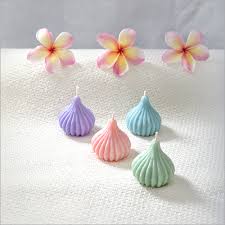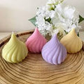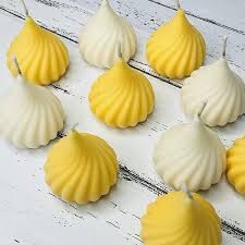 The candle is a pretty all colour costumized color with a shell-like or pumpkin shape having wavy ridges. The top part of the candle has sparkly glitter on it, giving it a cute decorative touch. There's a white wick sticking out from the top. It's placed on a light beige surface with some dried flowers and pearls around it, looking super aesthetic 😊.